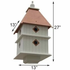 Provide a comfortable home for purple martins to colonize with the Heath Purple Martin Deluxe Aluminum House – 18 Rooms. This top-quality, easy to clean house is constructed of rust-free aluminum to dissipate heat, and its crisp white and soothing green exterior complements any lawn or garden. Each of the eighteen trapezoid-shaped apartments measures 9″ wide at the front, 3″ wide at the back, 6″ deep, and 6″ tall to give individual martin families plenty of room. All the porches of the three story house feature drainage holes in front of the 2.25″ diameter entrances and sturdy plastic perch rails for maximum comfort. The cupola conceals the ventilation hole, which helps regulate interior temperature.