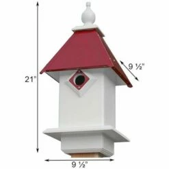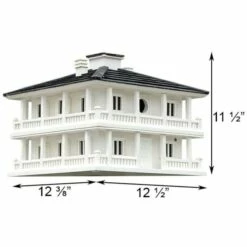 Begin or increase a martin colony when you add this robust, Coveside Purple Martin House to your area. This significant, lasting white pine shelter creates proper nesting opportunities for up to 8 martin families, encouraging them to begin colonizing your area. The 0.75″ thick, pine frame not only forms a lasting shelter; its light color also keeps each apartment cool during the summer heat, aided by top ventilation gaps. Each side of the home sports dual, 2″ diameter entries for eight total apartments, and a perching ledge below the openings offer your feathered friends a spot to sing or land without territory disputes. The downward sloping, overhanging roof panels and gaps on the corners of each nesting box keep the nests dry and allow any captured water to drain, while the rough hewn pine provides fledglings a secure grip for reaching the opening and exiting when ready. One panel on each side of the generous shelter lifts for maintenance and nest checks, and the center column accommodates a 1.75″ outer diameter pole (not included) for placement in your yard. The thick pine body will remain durable and usable for several seasons, aging to a striking gray over time to enhance its rustic style. Encourage martins to colonize in your area with this Purple Martin House. Made in the USA.